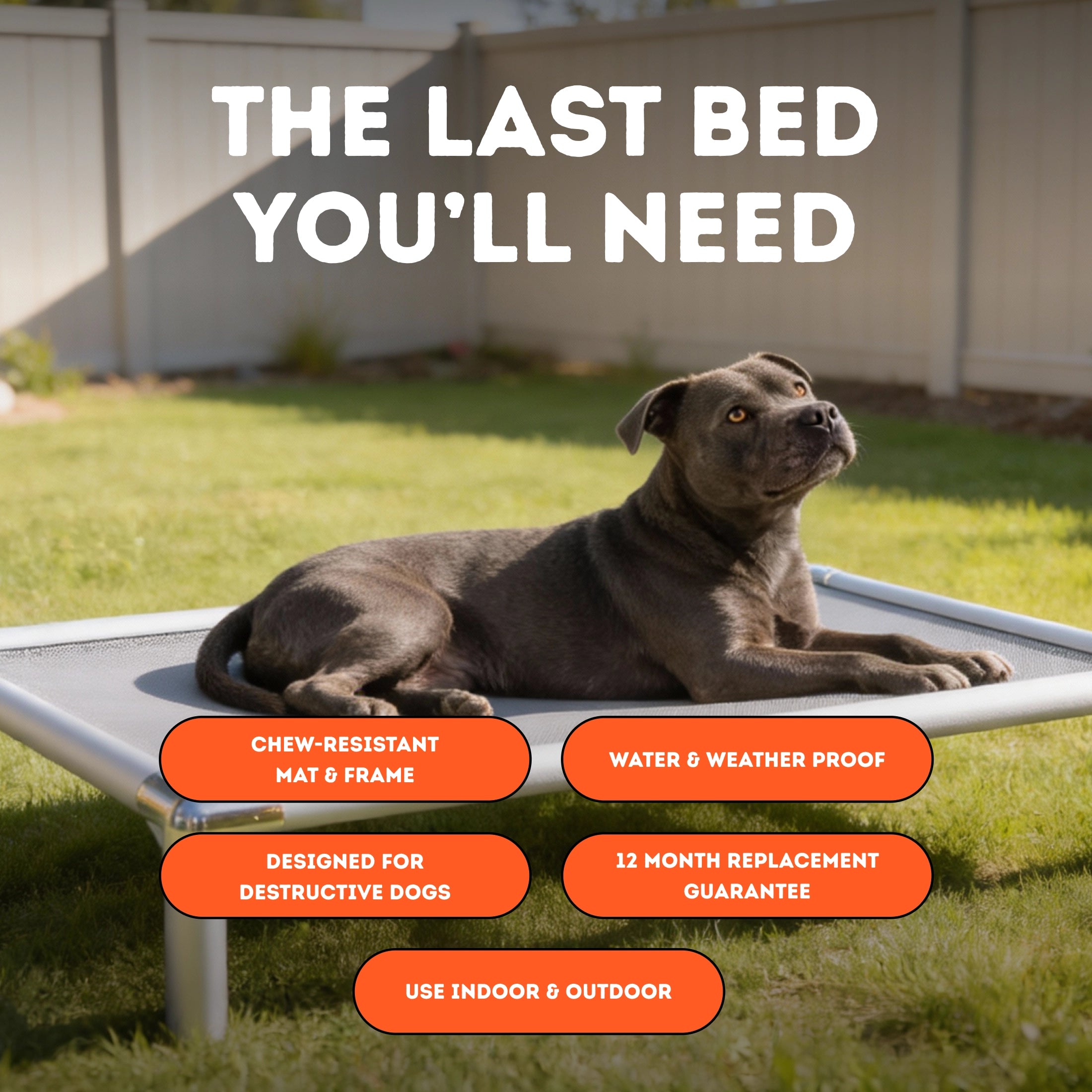 Made with reinforced anti-rust aluminium framing and our ChewGuard™ tear-resistant, waterproof fabric, this isn’t just another chew-resistant bed—it’s the ultimate outdoor bed for dogs that demolish everything. Whether your dog’s a digger, a shredder, or a relentless chewer, this bed stands up to it all while keeping them comfortable.