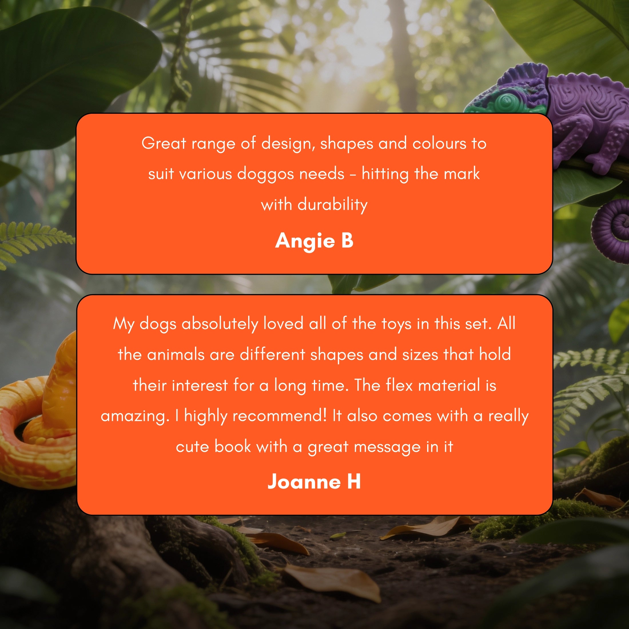 Every Jungle Trek Collection comes with a hardcover storybook written and illustrated by Happy Staffy Co. Perfect for fur children and real children, it’s packed with adventure and life lessons your whole family will love.